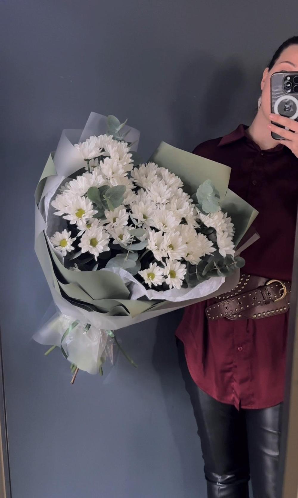 Сборный букет на основе кустовой хризантемы с добавлением эвкалипта, в оформлении матовой пленкой
