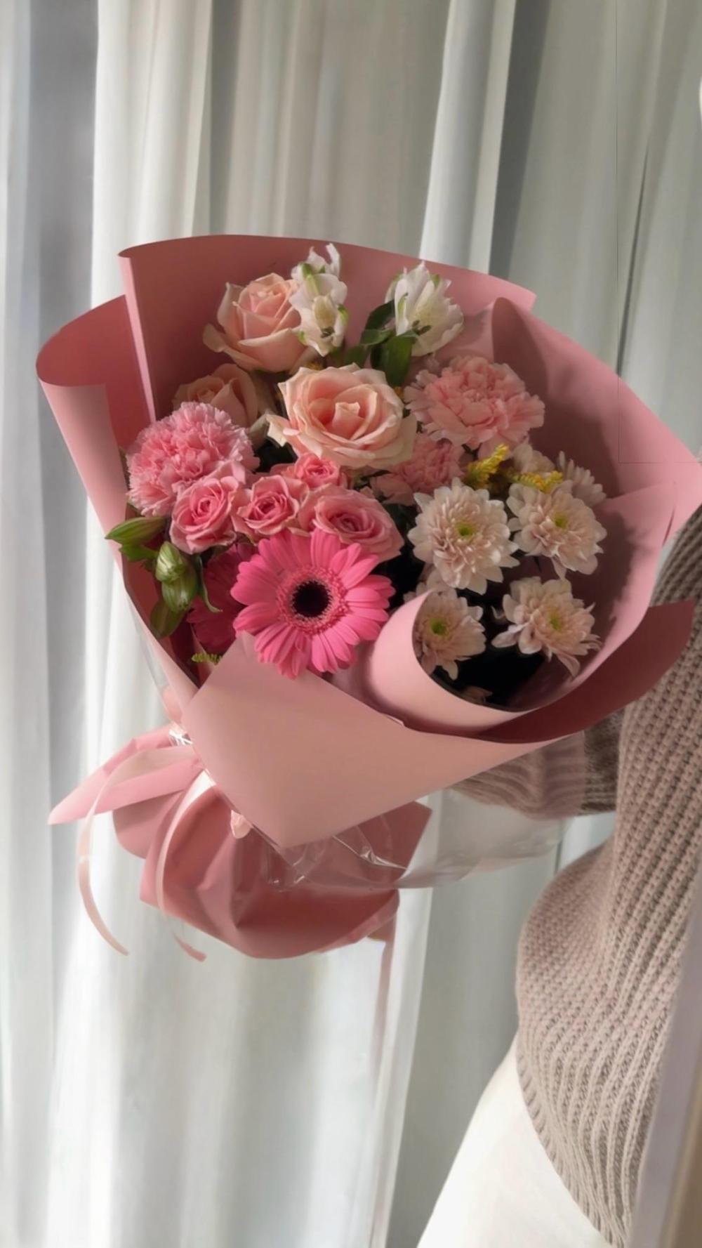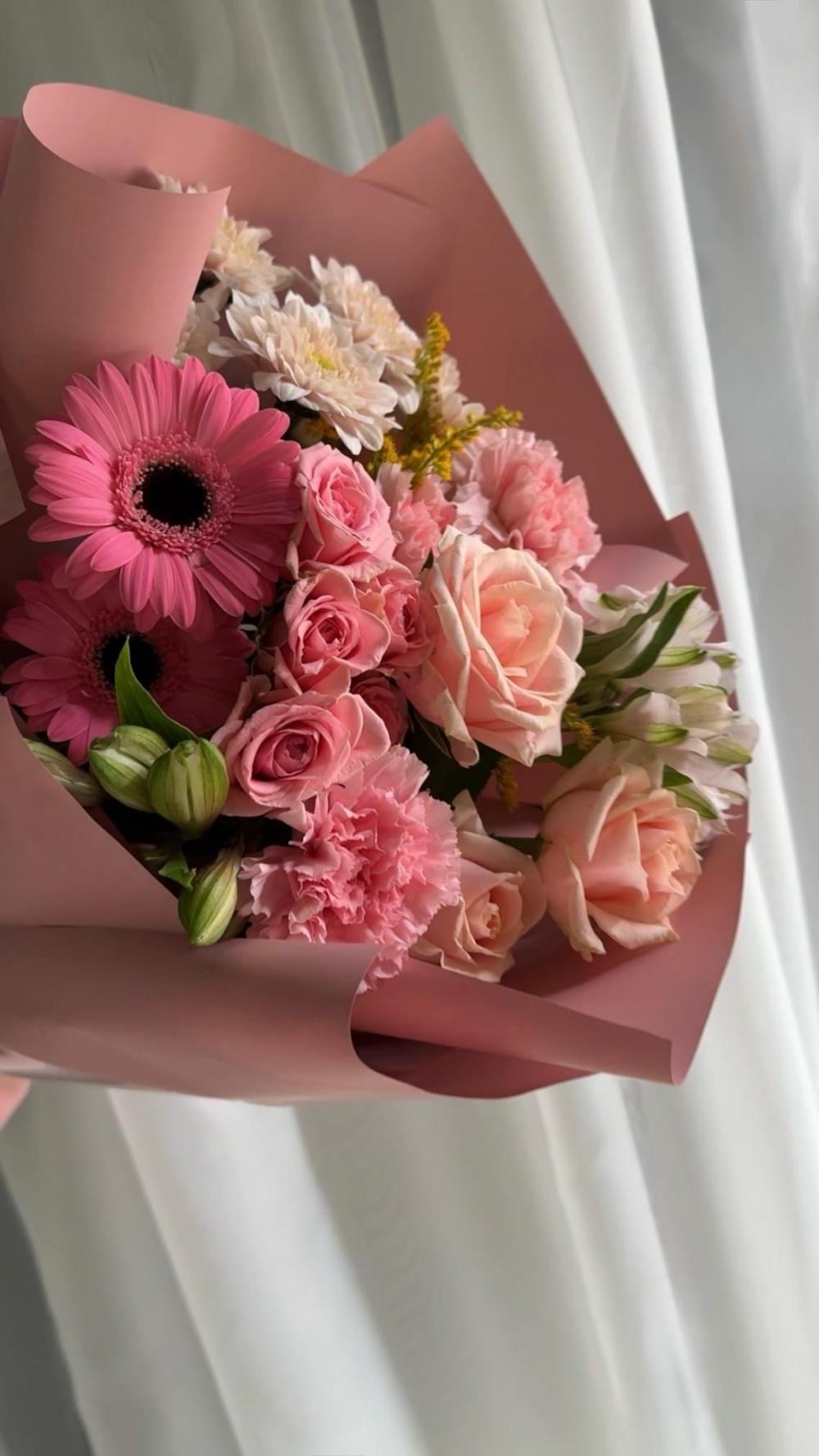 Состав: Розы нежные персиковые, розовые герберы, светлые альстромерии, розовый диантус.